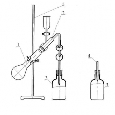 Аппарат состоит из колбы 1 вместимостью 250 мл, насадки 2 с краном и каплеуловителями, двух склянок 3 с пробками и трубки 4. Стеклянные изделия крепятся на штативе.