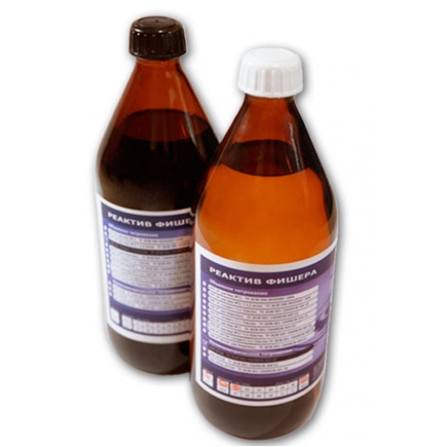 Реактив Фишера состоит из 2-х отдельных растворов -раствора №1, раствора №2, которые расфасованы в 1,0 л бутыль из тёмного стекла.