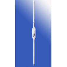 Пипетки с меткой исполнения "2" представляют собой стеклянную трубку с расширением посередине с одной круговой меткой. Объем жидкости, выливающийся самотеком из пипетки, заполненной до метки, определяет емкость пипетки. Пипетка заканчивается оттянутым носиком. По ГОСТ 29169-91 «Посуда лабораторная стеклянная. Пипетки с одной отметкой» выпускаются пипетки без времени ожидания второго класса точности.