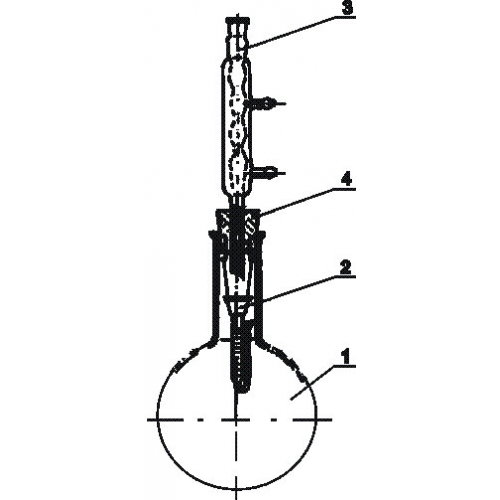 Прибор состоит из колбы 1, приемника 2 и холодильника 3, вставленного в колбу через резиновую пробку 4.
